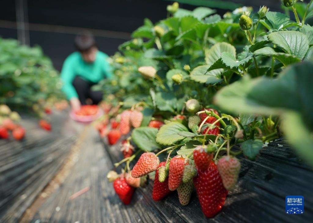3月28日,游客在秦皇岛市海港区海阳镇一家庭农场的大棚内采摘草莓。