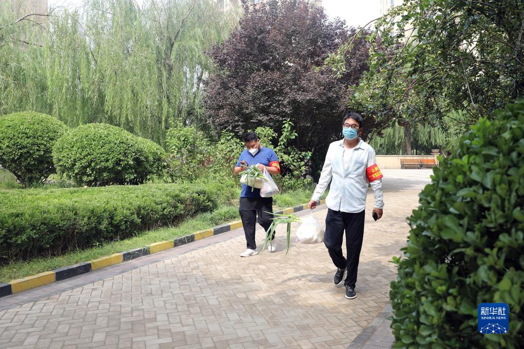 8月30日,在石家庄市众美绿都小区,社区志愿者为社区居民送生活物资。