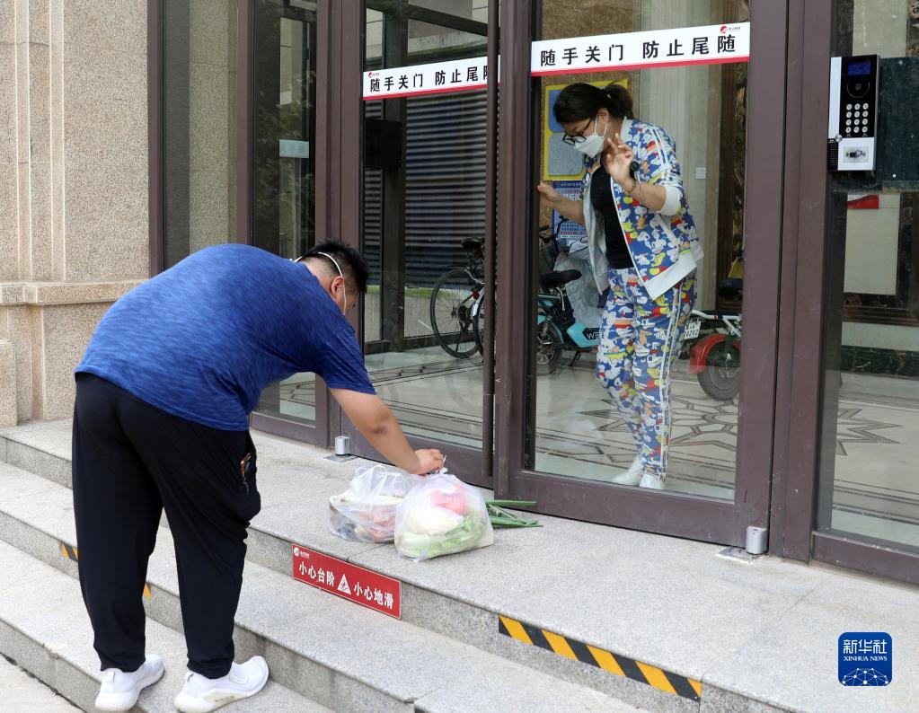 8月30日,在石家庄市众美绿都小区,社区志愿者为社区居民送生活物资。