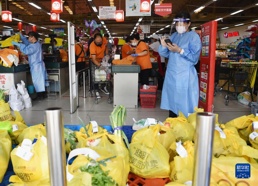 8月30日,石家庄市裕华区一家超市的工作人员在给通过互联网购物的市民备货打包。