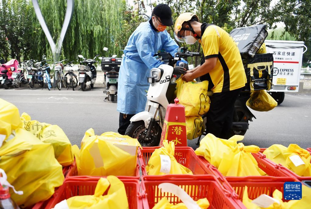 8月30日,在石家庄市裕华区一家超市保供点,外卖人员在打包,准备为市民送货。