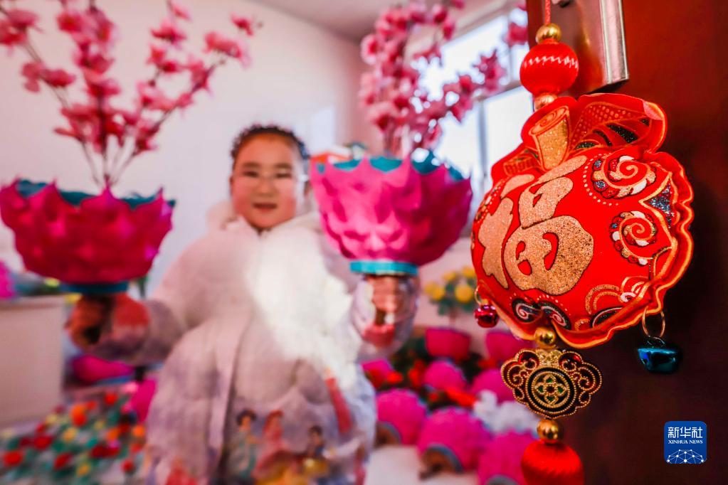 1月28日,迁西县洒河桥镇的一名小朋友在展示元宵节演出的跑花灯。