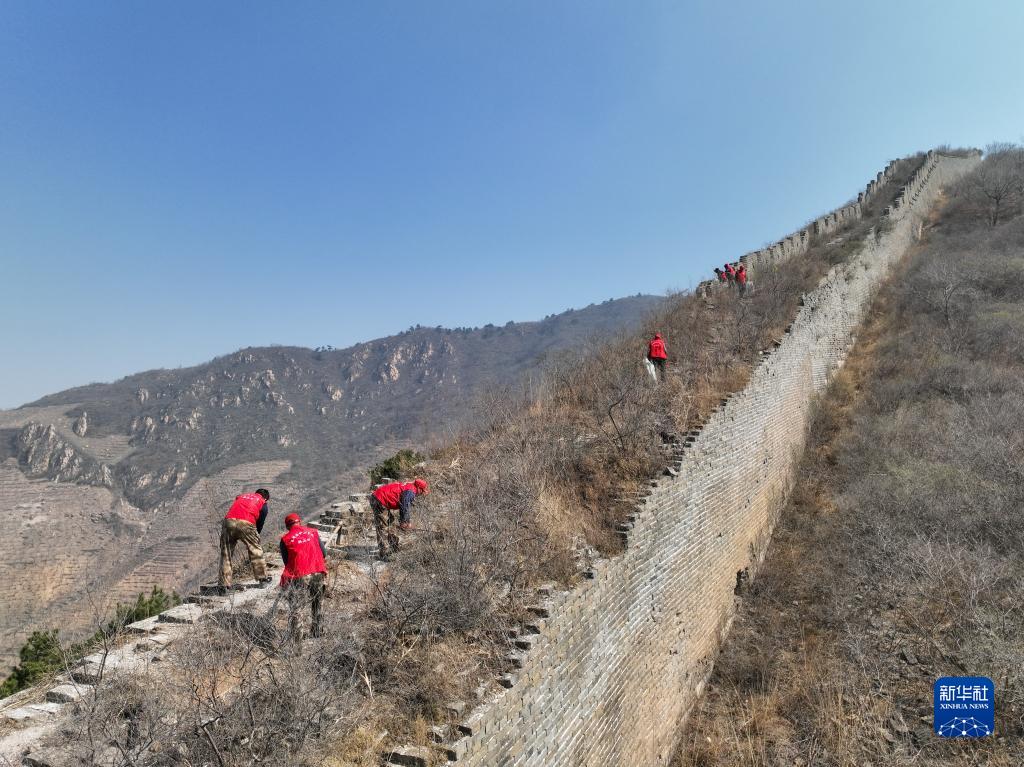 3月29日,“洪山口长城保护小分队”队员在长城上清理垃圾、树枝(无人机照片)。