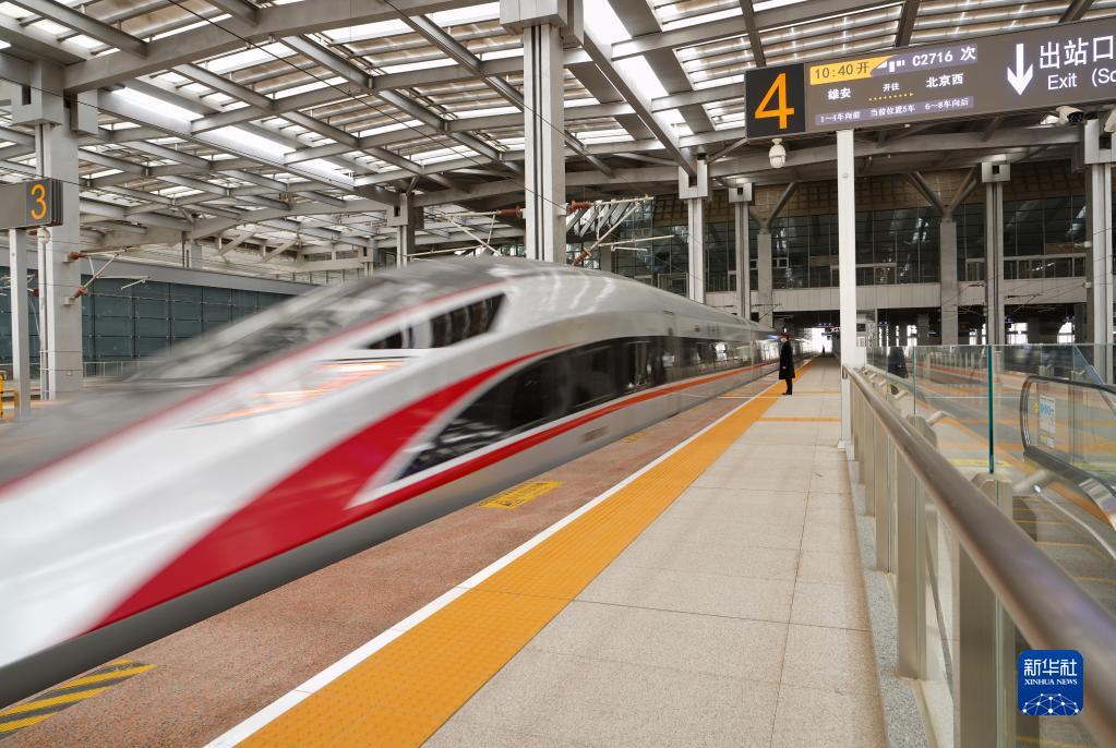 一辆高铁列车驶离京雄城际铁路雄安站,开往北京(3月22日摄)。