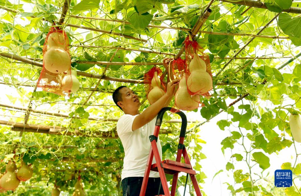 7月31日,文明实践志愿者在邢台市南和区郝桥镇尚鑫家庭农场帮助农民管护葫芦。