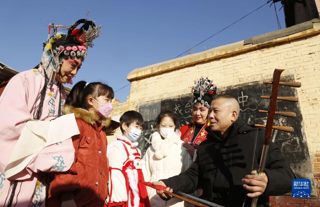 1月30日,在邢台市襄都区北大街街道办事处新兴东社区,演员给孩子们讲解非物质文化遗产四股弦知识。