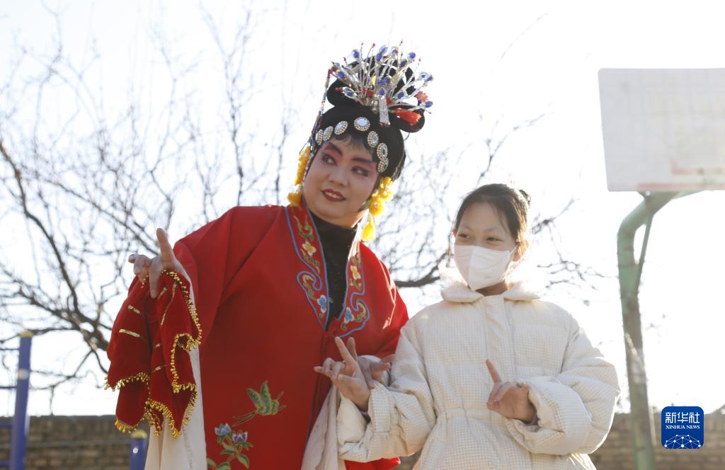 1月30日,在邢台市襄都区北大街街道办事处新兴东社区,演员给孩子们讲解非物质文化遗产四股弦知识。