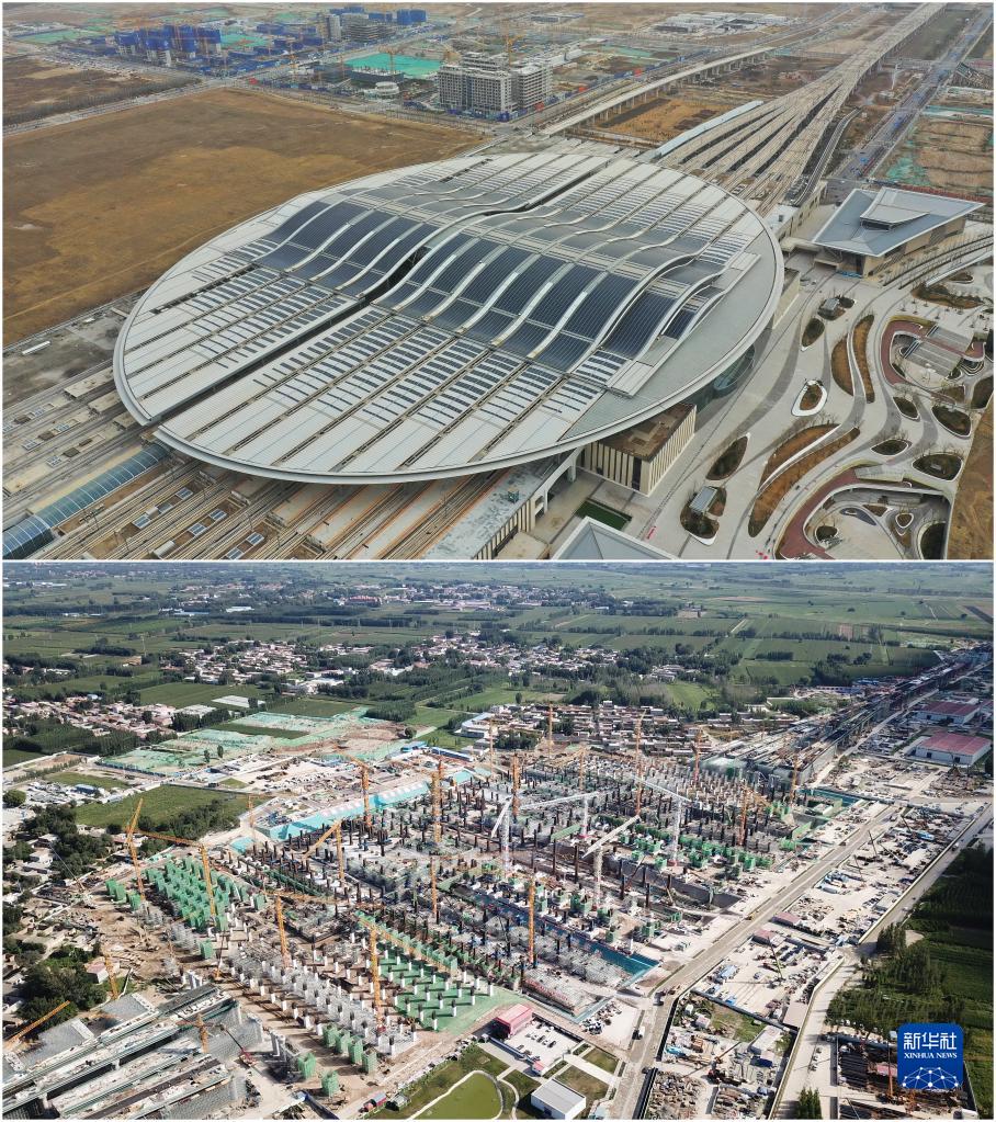拼版照片:上图为2023年3月23日拍摄的京雄城际铁路雄安站(无人机照片);下图为2019年8月29日拍摄的京雄城际铁路雄安站建设现场(无人机照片)。