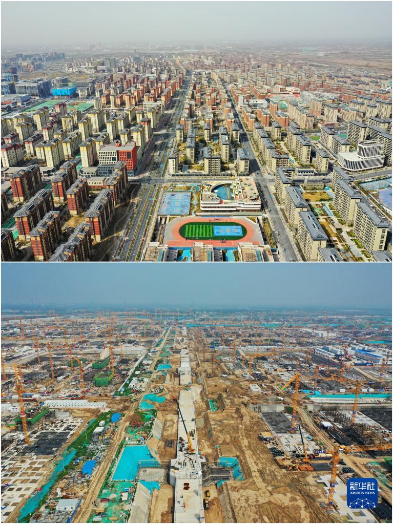 拼版照片:上图为2023年3月24日拍摄的雄安新区容东片区(无人机照片);下图为2020年8月11日拍摄的雄安新区容东片区建设现场(无人机照片)。