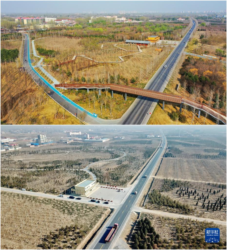 拼版照片:上图为2023年3月30日拍摄的雄安新区千年秀林(无人机照片);下图为2019年1月17日拍摄的雄安新区千年秀林(无人机照片)。