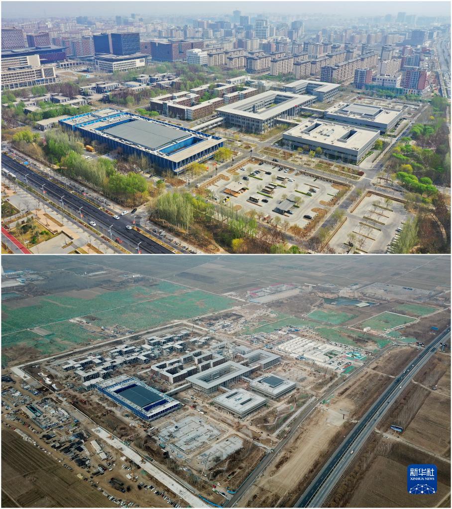 拼版照片:上图为2023年3月31日拍摄的雄安新区市民服务中心(无人机照片);下图为2018年3月21日拍摄的雄安新区市民服务中心建设现场(无人机照片)。