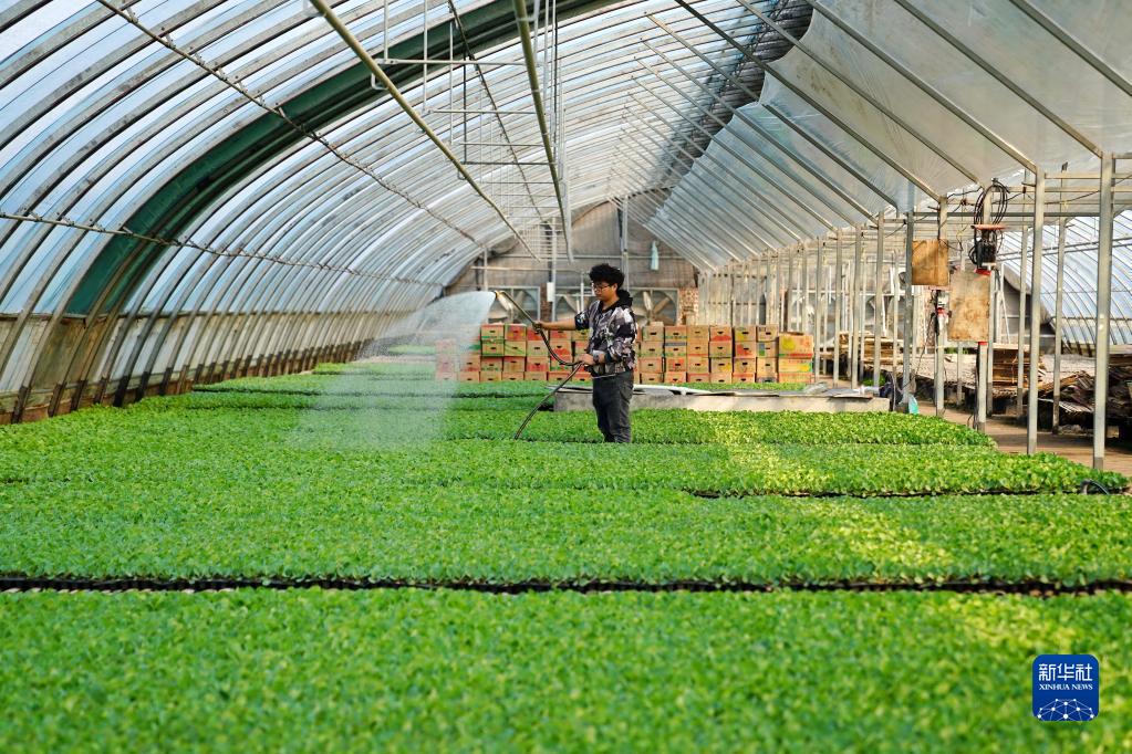 2月28日,河北省巨鹿县观寨镇南哈口村村民在育苗棚内给蔬菜秧苗浇水。