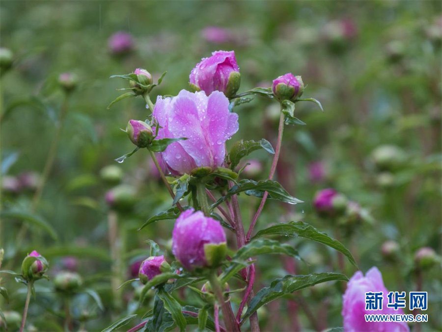 芍药花在绵绵细雨中绽放,娇艳欲滴。新华网发 李合印摄