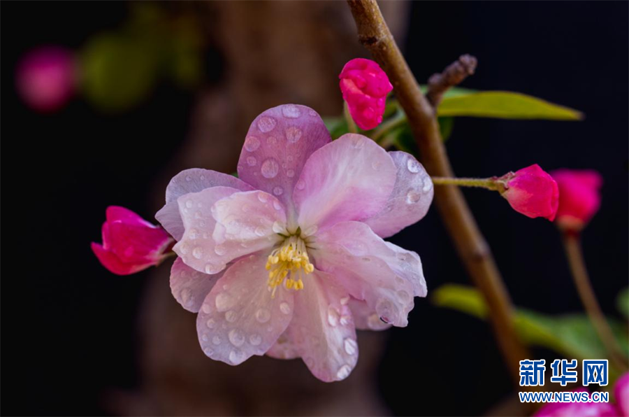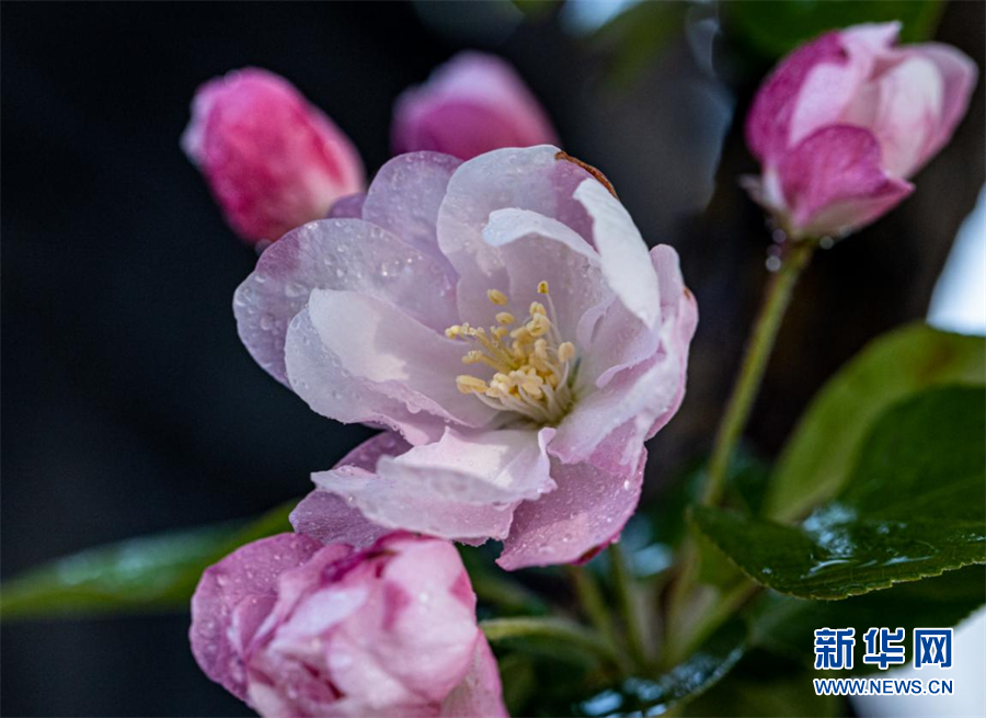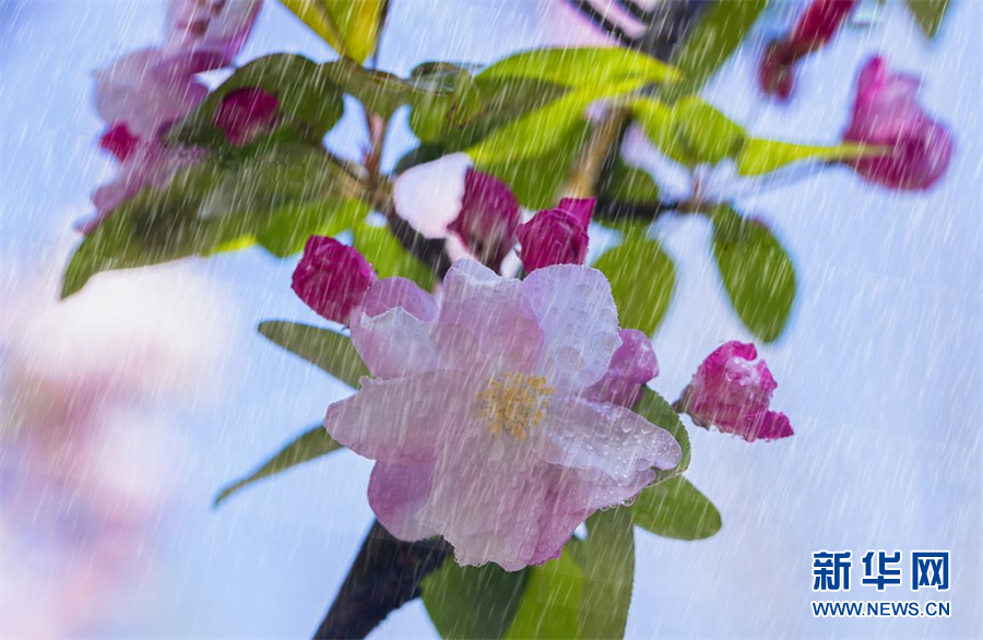 海棠花享受春雨的洗礼,别有一番意境。新华网发 李合印摄