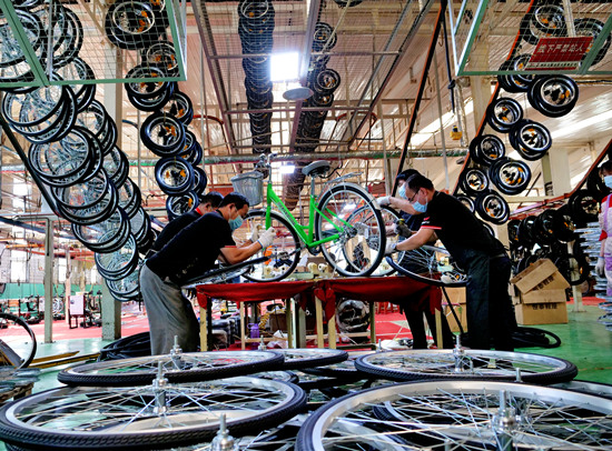 临西县一家轴承企业生产车间内,工人正将刚从自动化生产线上下线的一批轴承产品运往检测区。 刘聪摄