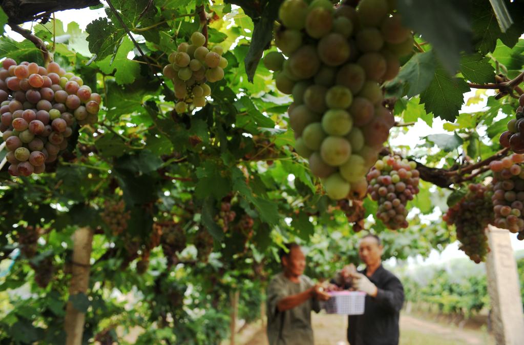 这是田园综合体旅游景区工作人员在采摘葡萄。(受访单位供图)