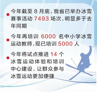 继续因地制宜推进冰雪运动进校园、进企业、进机关、进社区、进乡村等。从7月开始,省体育局联合省教育厅,组织开展了新一年的中小学冰雪运动教师培训。今年全省将有6000名中小学体育教师,分批次接受冰球、陆地冰壶、轮滑、速滑等项目的培训,截至目前,已培训20期、5000人。启动了新一年的农村中小学配备轮滑鞋计划,安排500万元用于农村中小学轮滑鞋采购、配发工作,现已完成采购方案报审。(记者陈华)