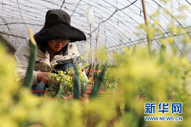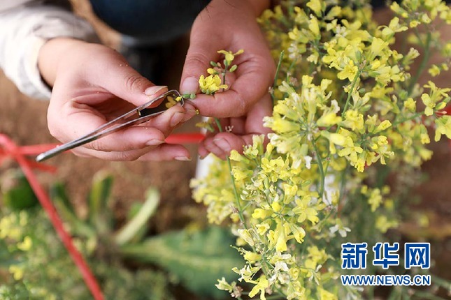 图为工作人员为花椰菜幼苗授粉。新华网发 宋杰摄