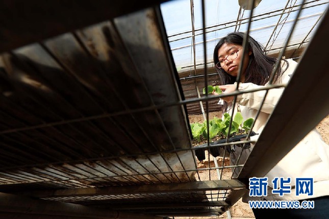 图为工作人员在查看西葫芦幼苗生长情况。新华网发 宋杰摄
