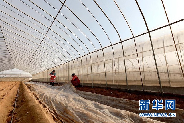 图为工作人员在大棚内铺设地膜。新华网发 宋杰摄