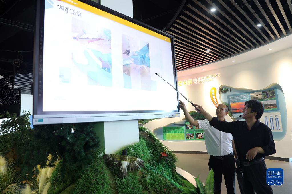 7月6日,在河北省张家口市康保县康巴诺尔国家湿地公园宣教中心,麻喜荣(右)在介绍遗鸥救助情况。