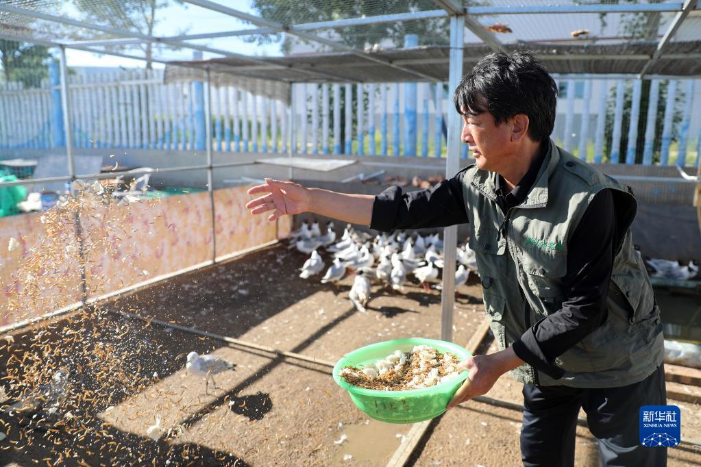7月6日,在河北省张家口市康保县遗鸥保护协会野生动物救助站,麻喜荣为遗鸥投喂食物。