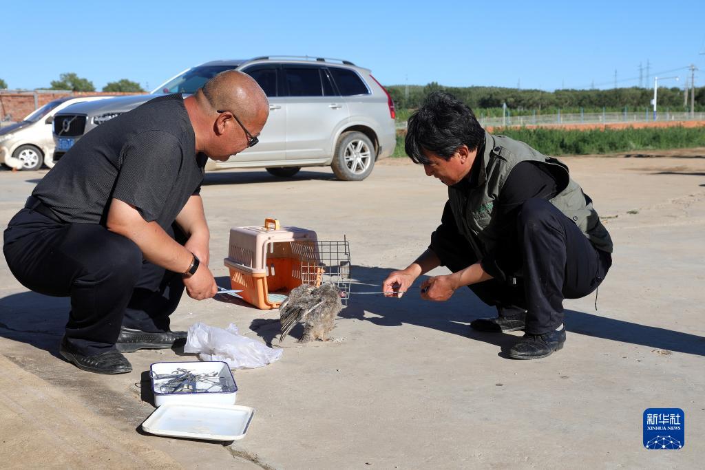 7月6日,在河北省张家口市康保县遗鸥保护协会野生动物救助站,麻喜荣(右)和工作人员给救助的小雕鸮喂食。