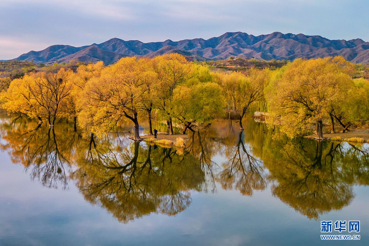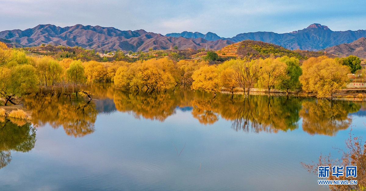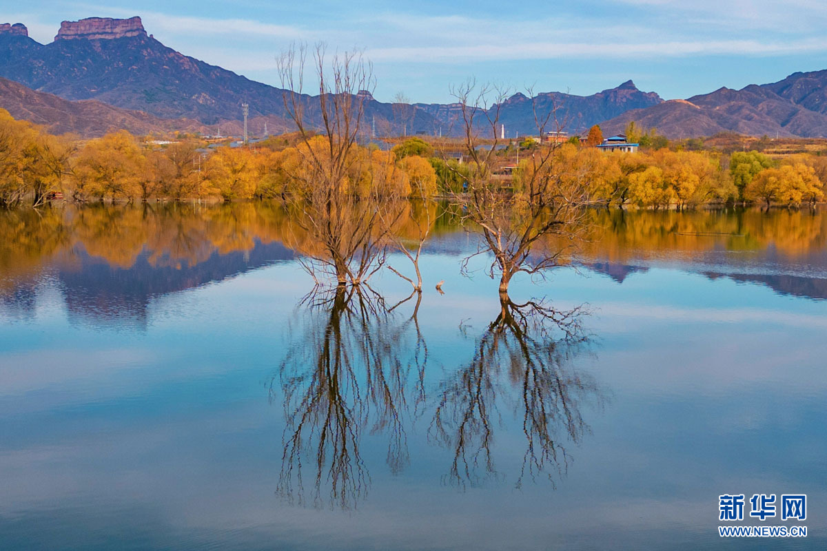 位于石家庄市赞皇县的平泉湖畔,金黄的树木倒映在清澈的水中,为湖面增添了不少的色彩,也为寂静的冬天增添了几分别样的韵味。新华网发 褚付金 摄