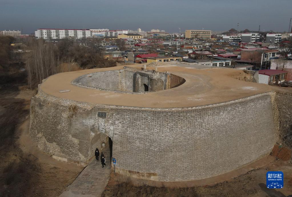 1月7日,人们从卢龙县城的明代永平府城墙西门瓮城走过(无人机照片)。