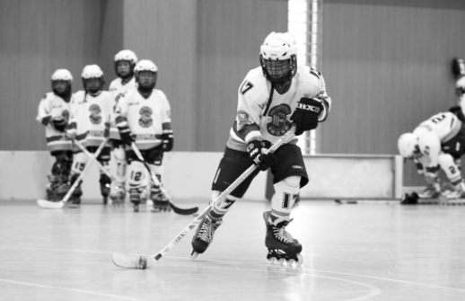 石家庄市柏林庄学校的学生正在学校体育馆内进行轮滑球训练。记者 梁子栋 摄