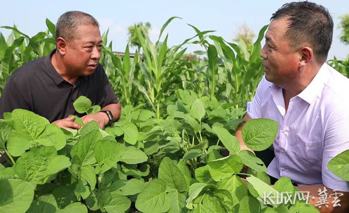 邢台市任泽区农业农村局农业技术推广研究员李庆彬(右)在田里指导赵孟辉种植大豆。陈惠浩 摄