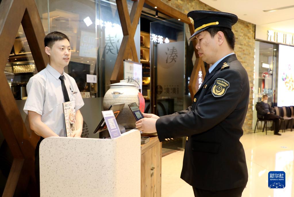 监管员论海根在餐厅门前扫码上传检查结果。新华社记者 冯维健 摄