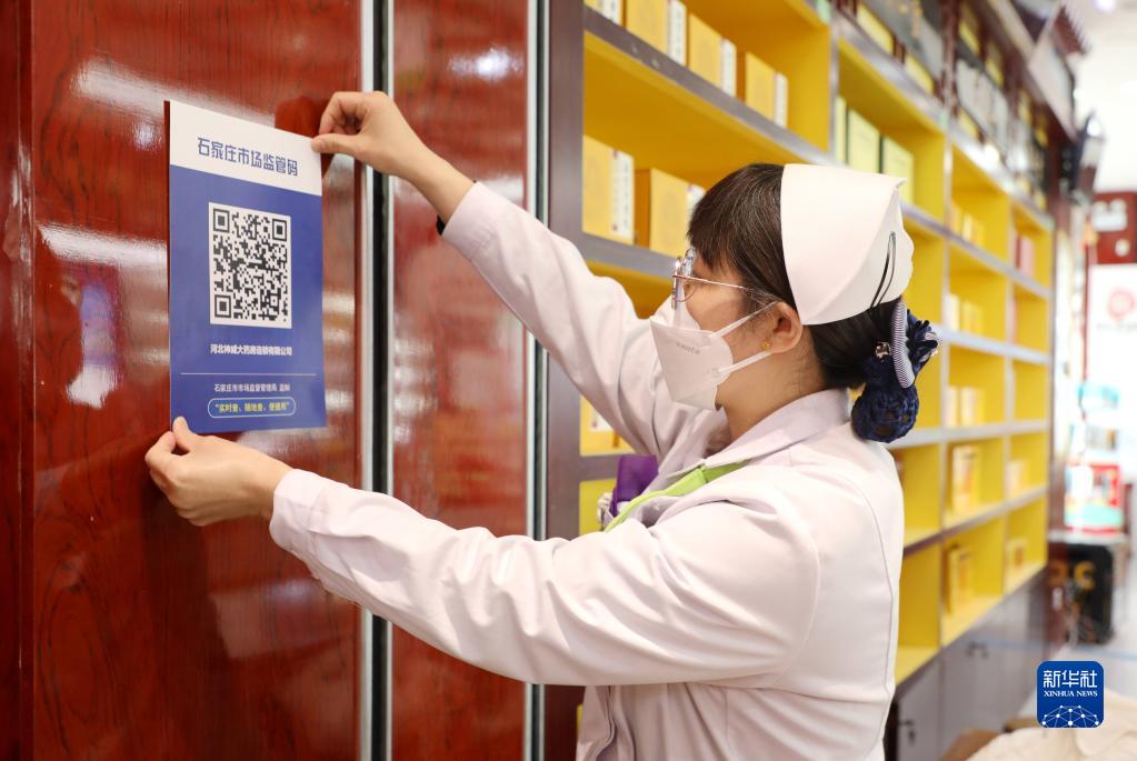 河北神威大药房石家庄中华店入口处张贴着“石监码”。记者扫码看到,这家店的食品、药品、医疗器械经营许可证一应俱全。这些经过整合与集成的电子化信息,比墙上分散张贴的各类纸质证明更简洁易懂。