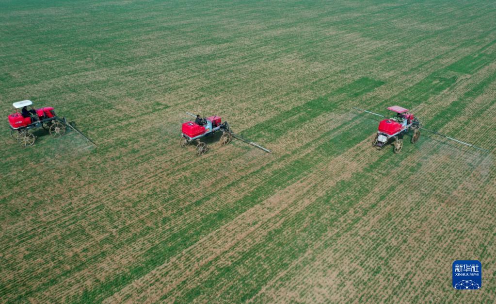 河北省邢台市南和区胡佃村的农民在驾驶农业机械喷洒药品。(新华社记者 郭雅茹摄)