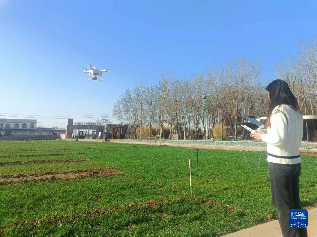 中国农业大学曲周实验站工作人员张哲在利用无人机查看小麦长势。(新华社记者 赵鸿宇摄)