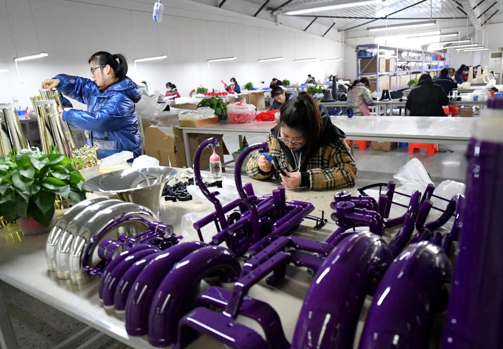 正欧乐器有限公司的工人在拼装树脂乐器。(武强县委宣传部供图)