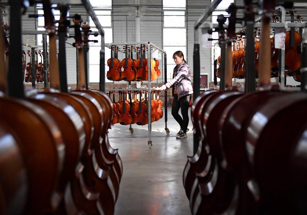 武强嘉华乐器有限公司的工人在整理小提琴。(武强县委宣传部供图)