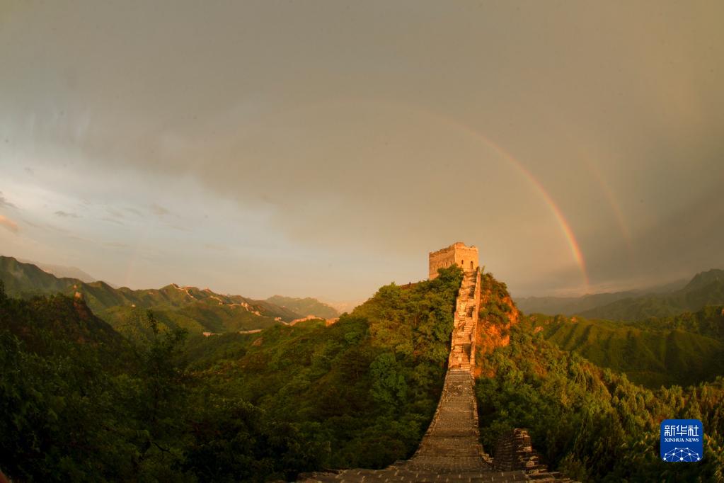 6月14日傍晚,一场雷阵雨过后,位于河北省承德市滦平县的金山岭长城出现双彩虹景观。