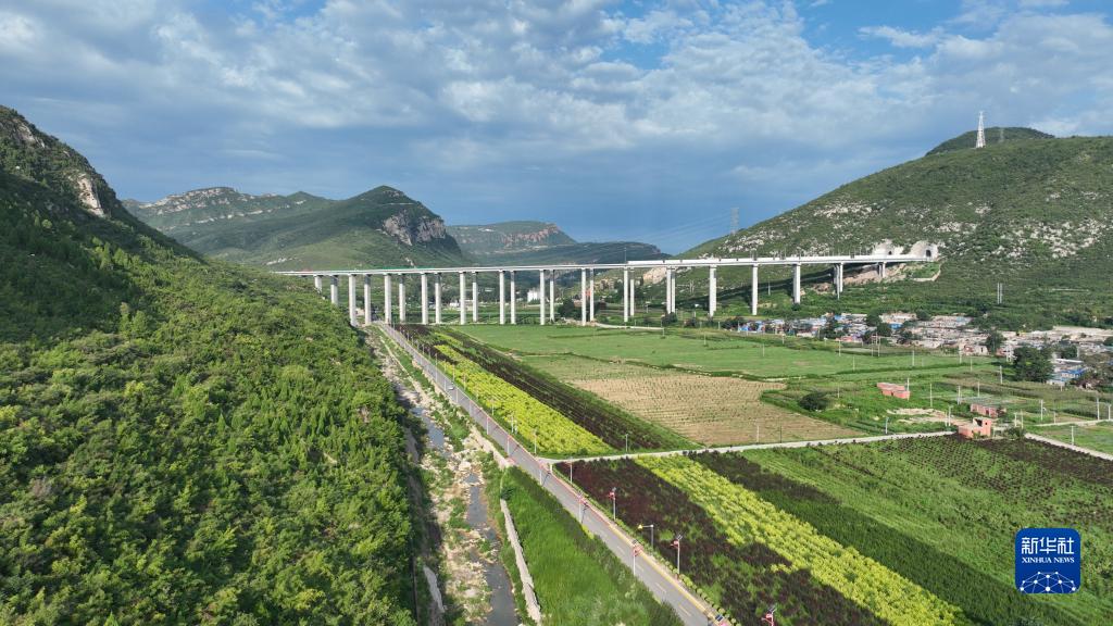 信都区西部山区的抗大路与太行山高速公路相互交错(8月17日摄,无人机照片)。