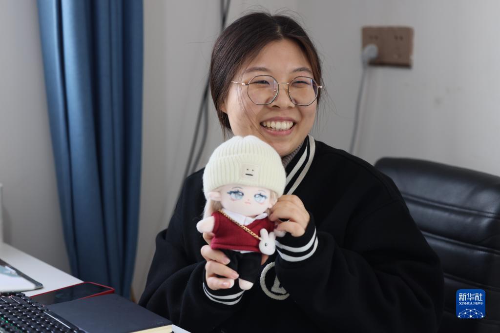 杨鑫博在项目部办公室展示新购买的玩偶(2月15日摄)。