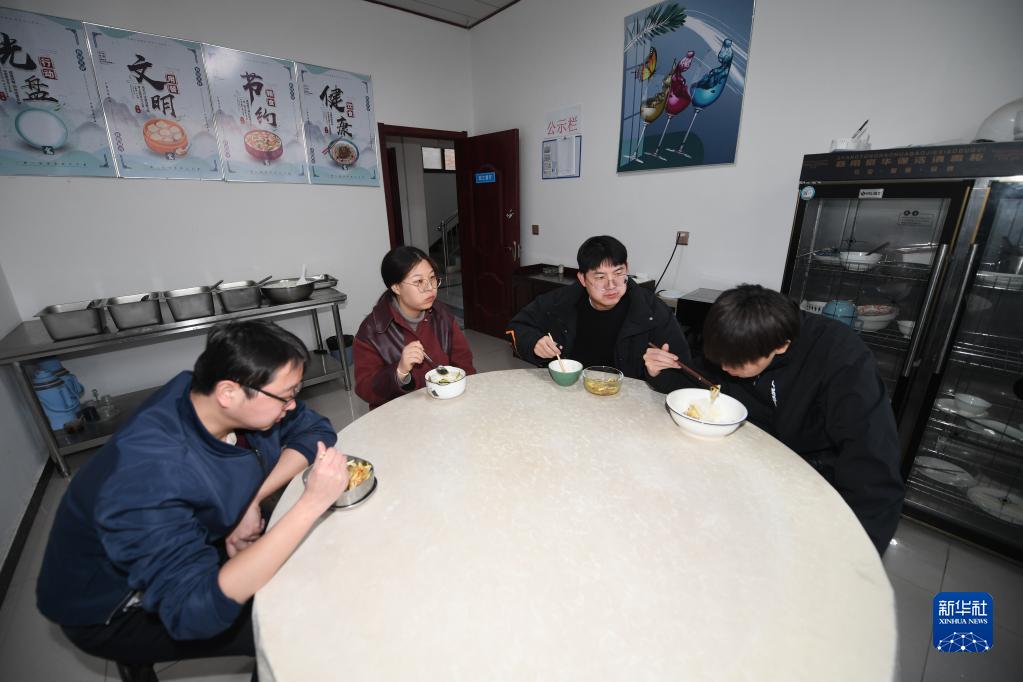杨鑫博(左二)和同事在项目部食堂吃饭(2月15日摄)。