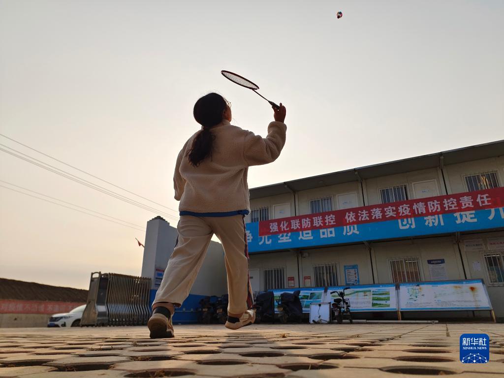 杨鑫博在项目部小院打羽毛球(2月15日摄)。