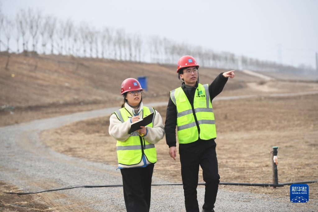 杨鑫博(左)和同事在雄安唐河河谷郊野公园项目现场工作(2月15日摄)。