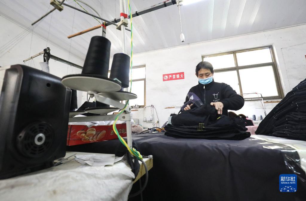 11月17日,在行唐县上方乡东井底村,当地村民在赶制服装订单。