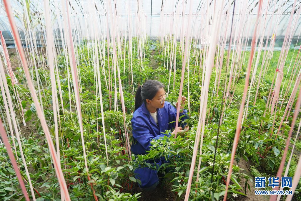 2月17日,张莎莎在试种棚内查看农作物长势。