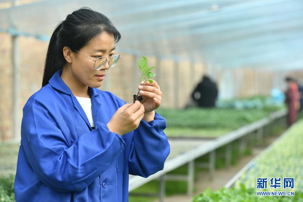 2月17日,张莎莎在育苗棚内查看秧苗长势。