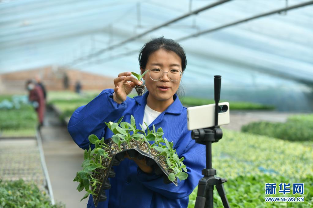 2月17日,张莎莎在育苗棚内通过直播的方式推介产品。
