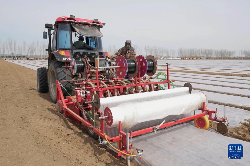 3月18日,唐山市曹妃甸区第六农场一家农业合作社的社员在使用机械设备播种。