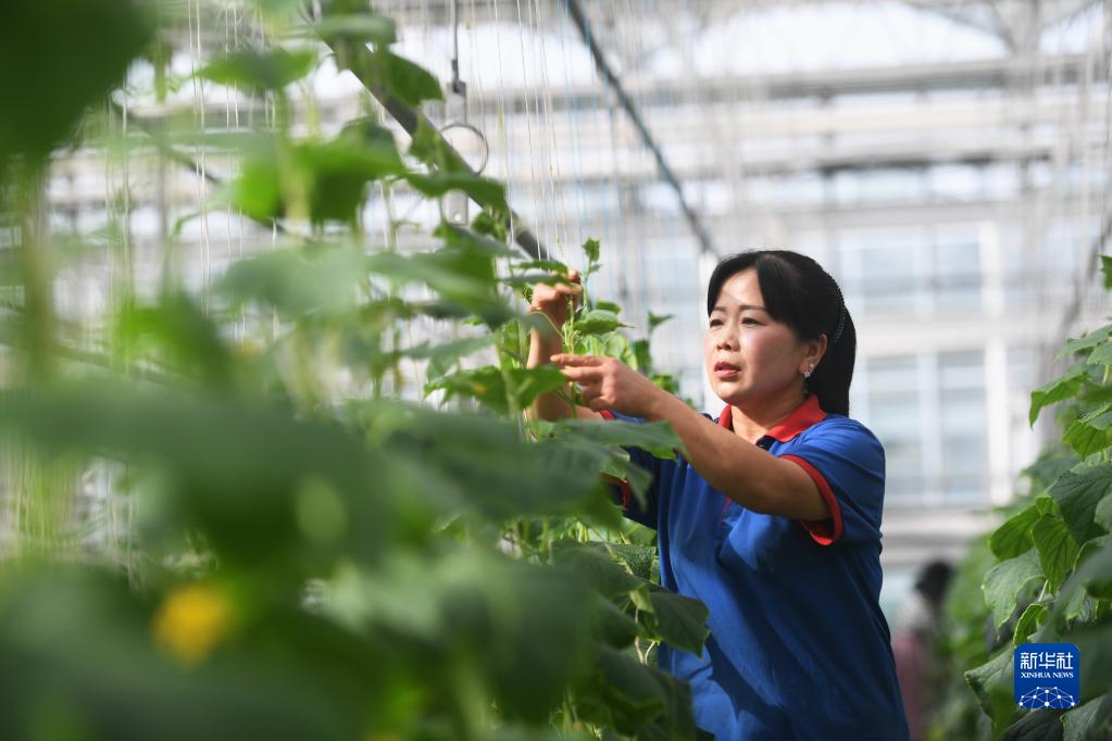4月18日,河北省邢台市南和区贾宋镇一家现代农业园区工人在对黄瓜进行日常管理。