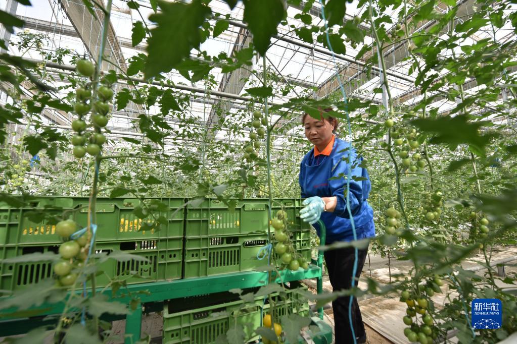 4月18日,河北省邢台市南和区贾宋镇一家现代农业园区工人在采摘西红柿。
